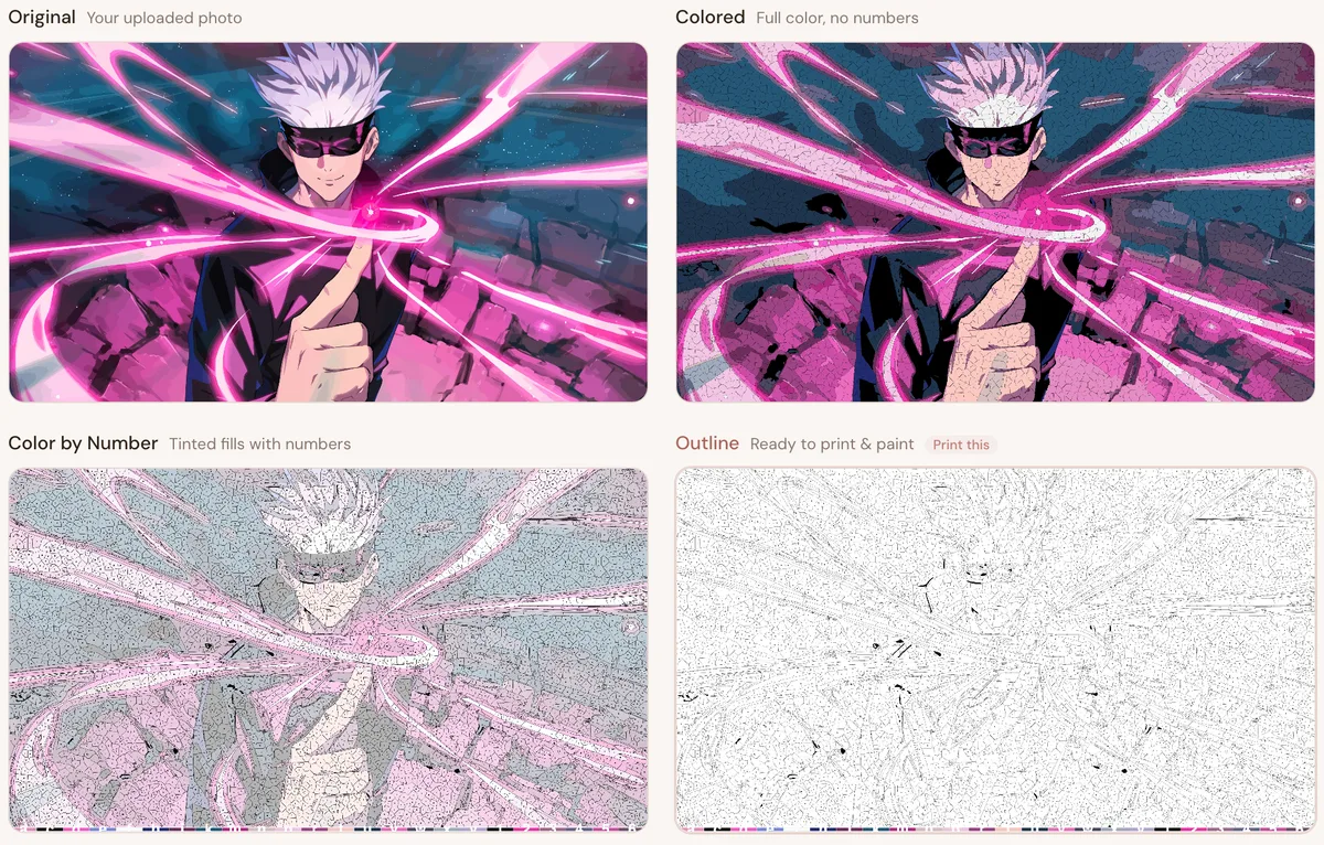 Once you've chosen your colors and detail level, the tool will generate a black‑and‑white outline with numbered areas in a few seconds.